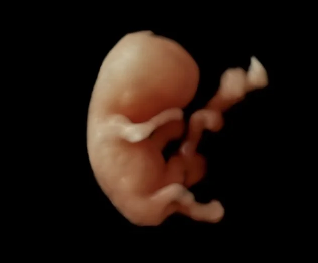 Alle indre og ytre strukturer er ferdige og embryonalfasen avsluttes. Barnet kalles nå et foster og skal vokse og modnes frem mot fødsel. Fingre, tær, armer og ben er tydelige.